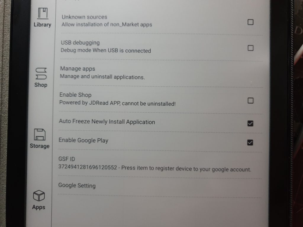ตัวเครื่องมันเองนั้นมาพร้อมกับโปรแกรมอ่าน e-book ในตัวอยู่แล้ว (แหงล่ะ) และมาพร้อมกับร้านขาย e-book ของ JD ซึ่งส่วนมากก็เป็น e-book ภาษาจีน ดังนั้น ปิดทิ้งครับ โดยเราจะสามารถปิดร้านของ JD ทิ้งได้ผ่านหน้า Settings (แต่เมนูจะยังอยู่ ลบออกไม่ได้)